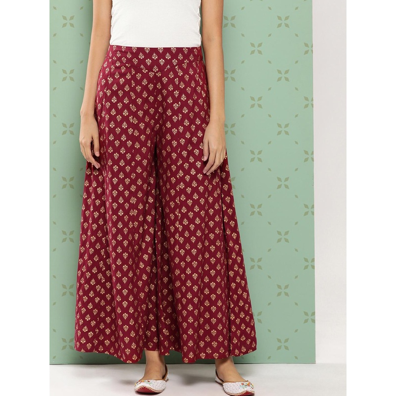 Maroon and gold-toned woven palazzosEthnic motifs printedOpaqueFlared fitPartially elasticated waistbandLength: regularWoven RayonfabricSIZE & FITFlared FitSize worn by the model: sWaist: 25.5''Hips: 35''Height: 5'8\"MATERIAL & CARERayonHand Wash