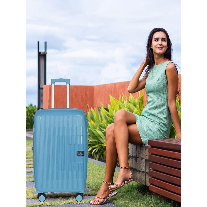 Sea-green textured hard-sided trolley suitcase, secured with Combination lockOne handle on the top, has a retractable trolley handle360-degree rotatable corner-mounted inline skate 8 wheelsOne main compartments, has elasticated straps secured with click cl
